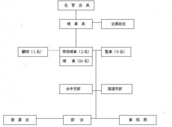 以上の活動は、下記の12部会が推進役となっています。 (1) 総務部会 (2) 会報部会 (3) 文化部会 (4) 体育厚生部会 (5) 婦人部会 (6) 日本人学校運営委員会 (7) 安全対策委員会 (8) 日台交流部会 (9) 台中支部 (10) 台中日本人学校運営委員会 (11) 高雄支部 (12) 高雄日本人学校運営委員会。