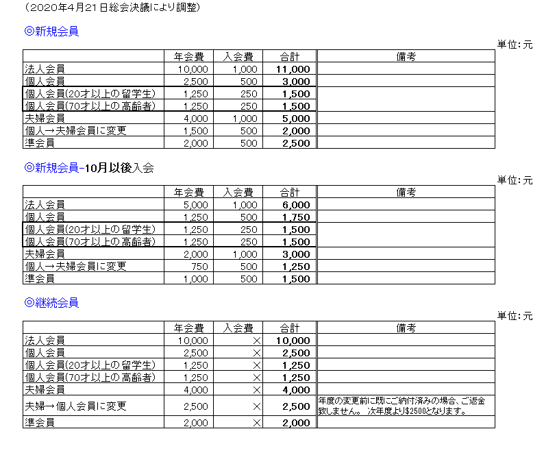 - 年会費については下記の通りです。