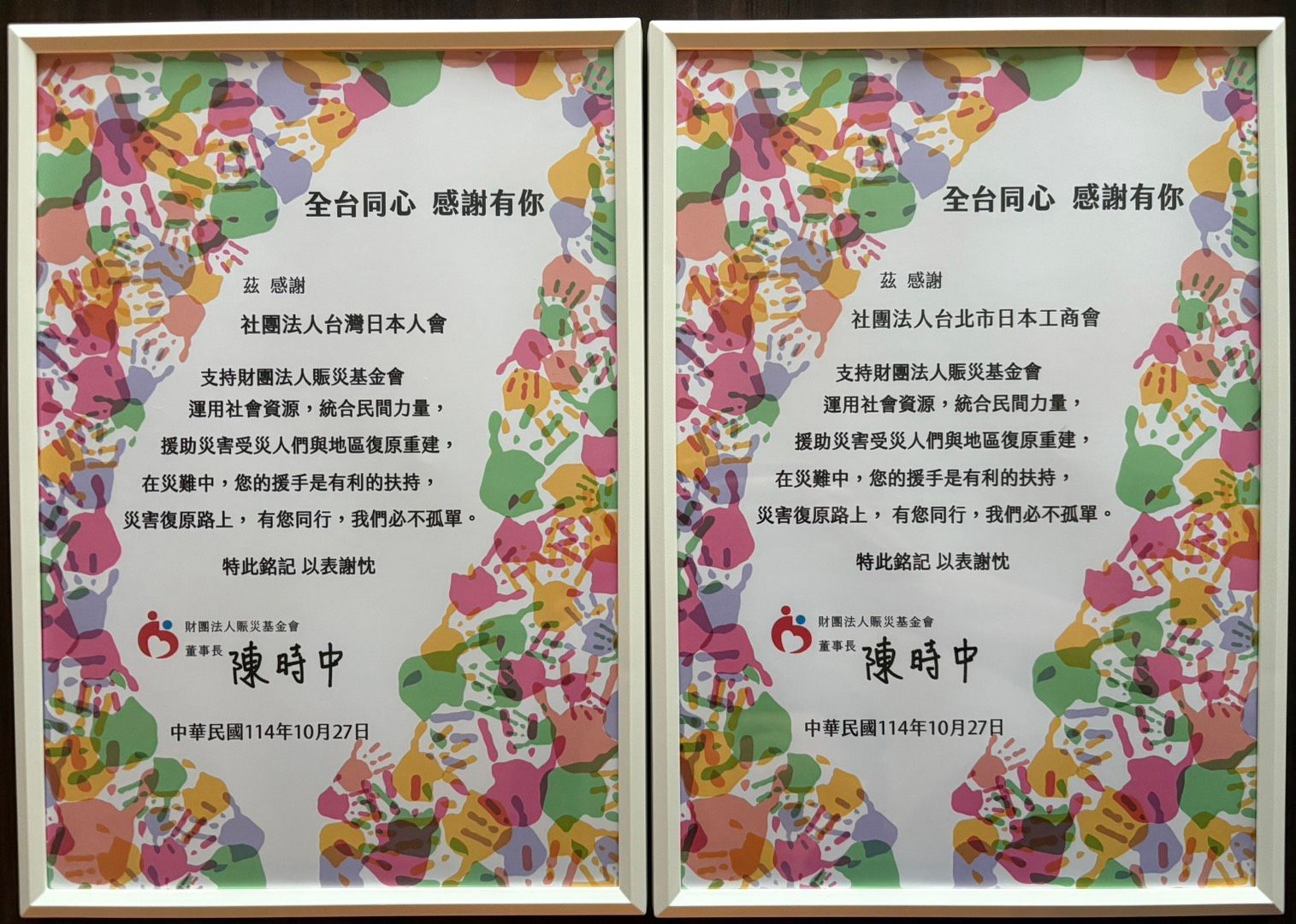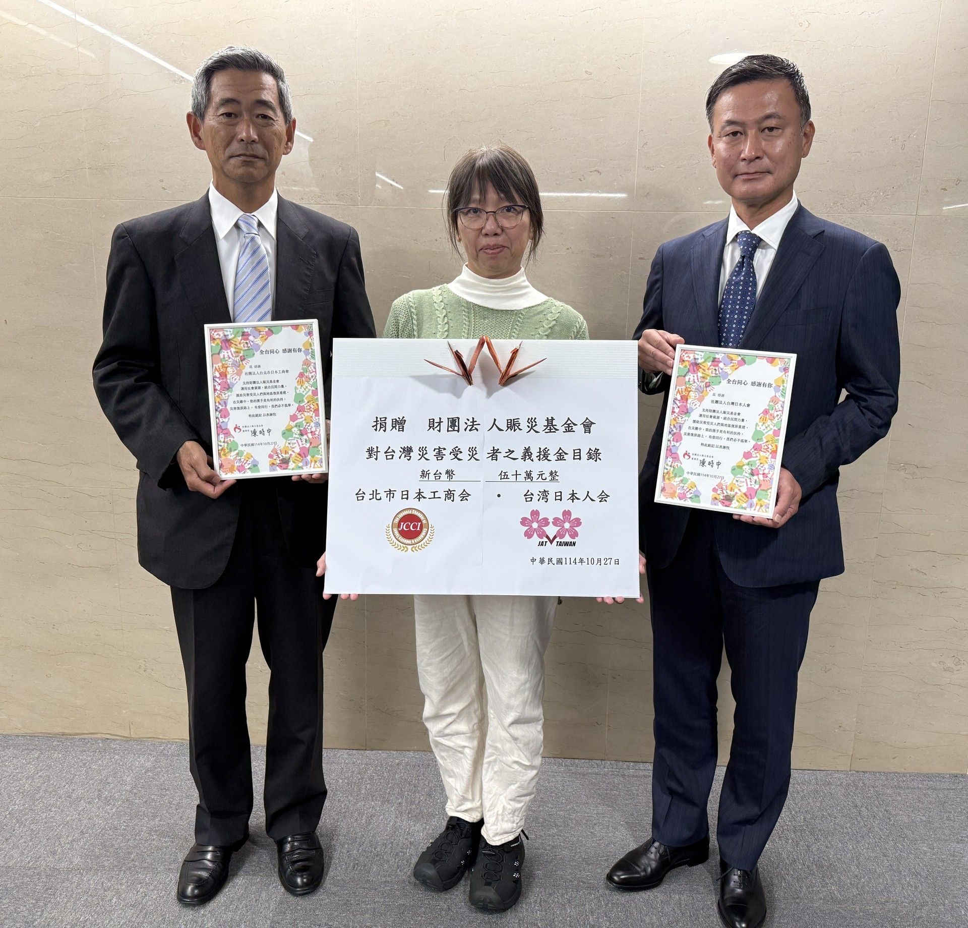 台北市日本工商會與台灣日本人會為協助今年在台灣多起災害中受災的民眾救援及災區重建,決定共同捐贈新台幣50萬元予「財團法人賑災基金會」。