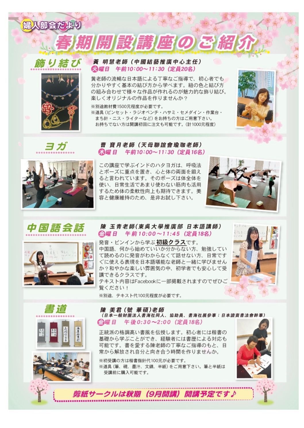 ※剪紙サークルは秋期に募集を予定しております。