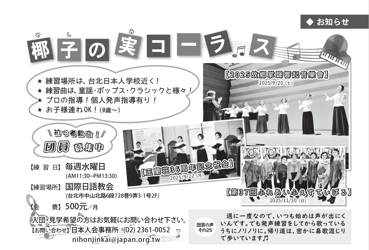 練習場所は台北日本人学校近くです。練習曲は、童謡、ポップス、クラッシックと様々。初心者大歓迎です。
